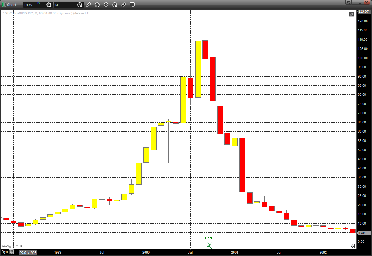 But all good things come to an end. Often, it ends with a bang. 10 months later, Corning was again trading at $30, where it had started its incredible 360 degree journey two and one half years earlier.